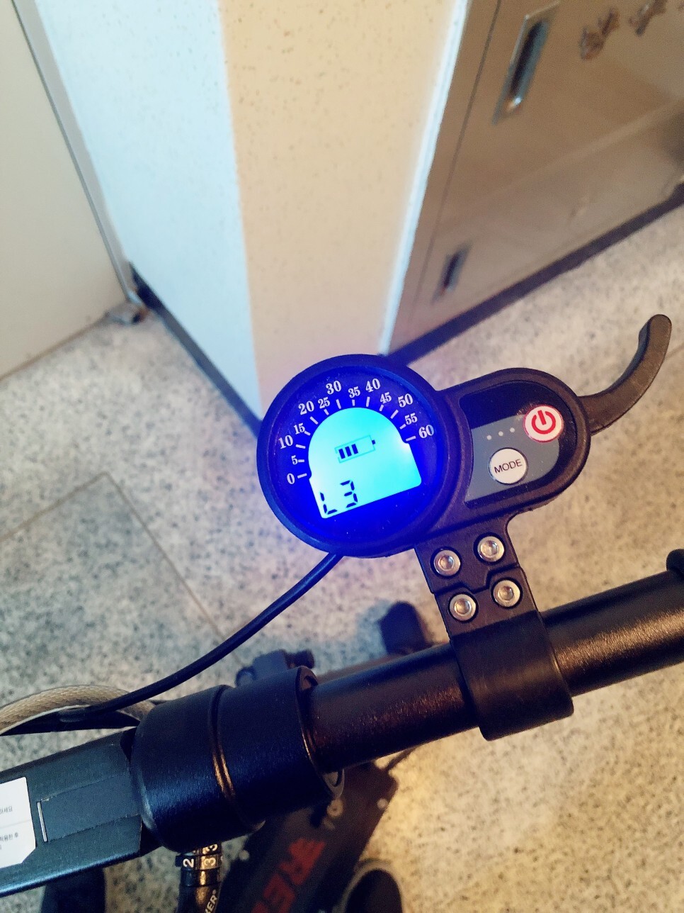 이제 구매한 킥보드를 직접 타본 후기를 말씀드리겠습니다. 킥보드를 사용하기 전 받침대를 젖히고, 전자 계기판의 전원버튼을 2초간 누르고 있으면 계기판이 켜집니다. 전자 계기판의 전원버튼을 짧게 누르시면 속력 단계를 조절할 수 있고, 다시 전원버튼을 2초간 길게 누르시면 전원을 끌 수 있습니다.